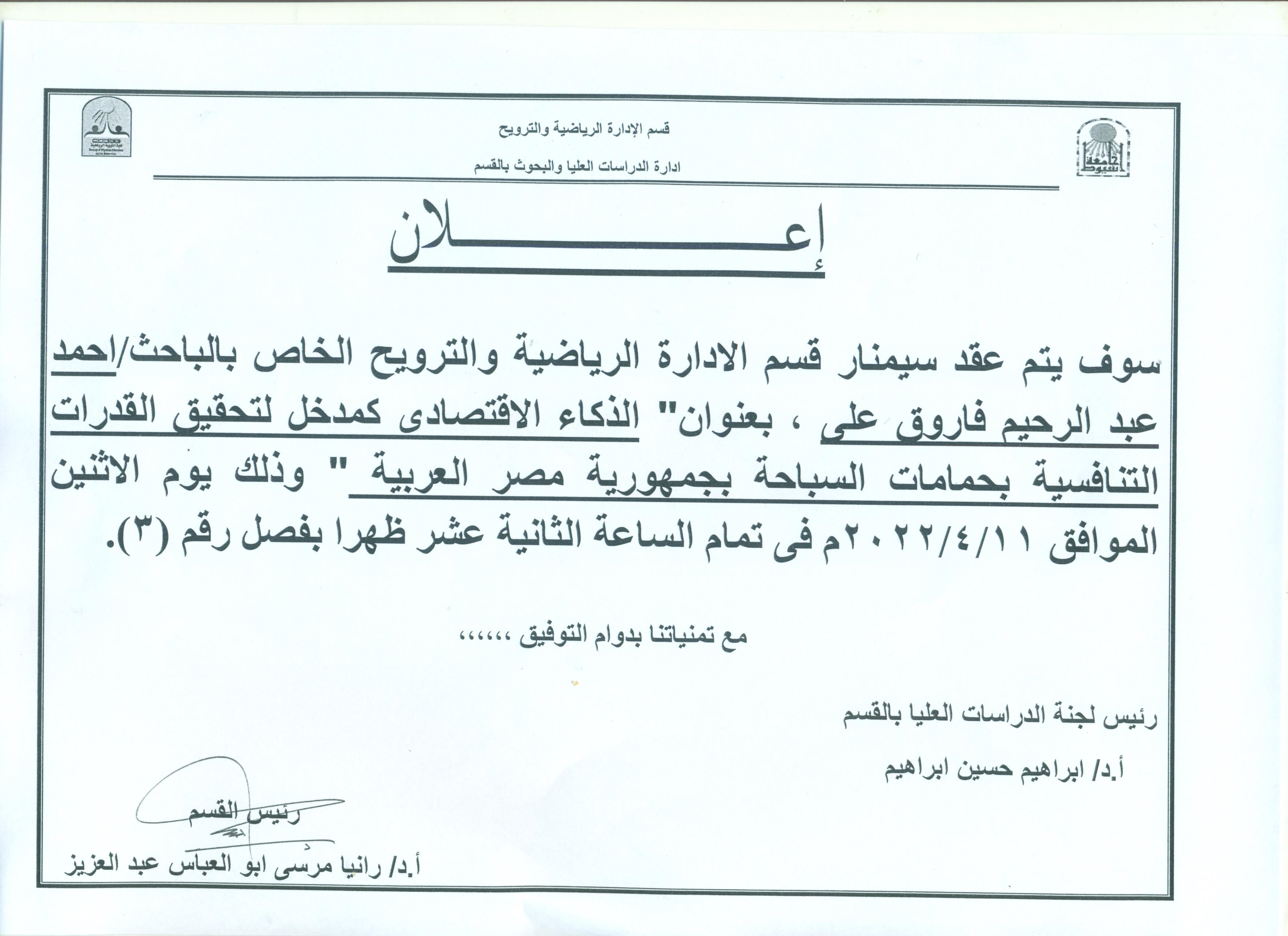عقد السينمار للباحث / محمود محمد حسين المقيد بقسم الادارة الرياضية والترويح