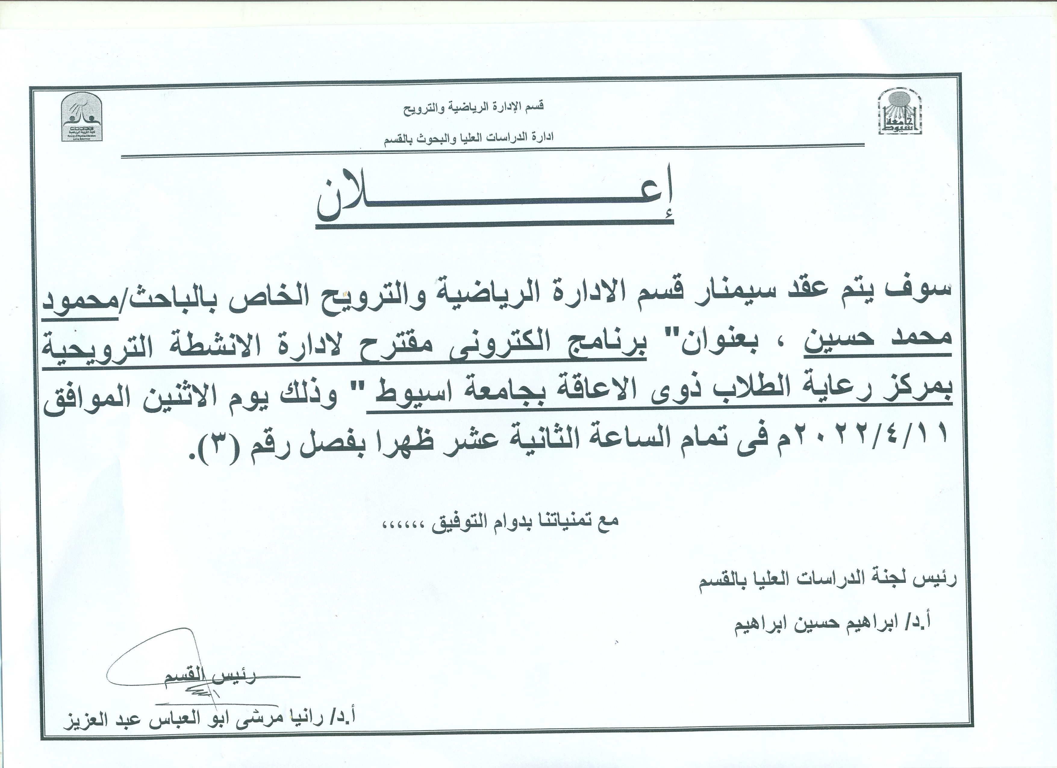 عقد السينمار للباحث / محمود محمد حسين المقيد بقسم الادارة الرياضية والترويح