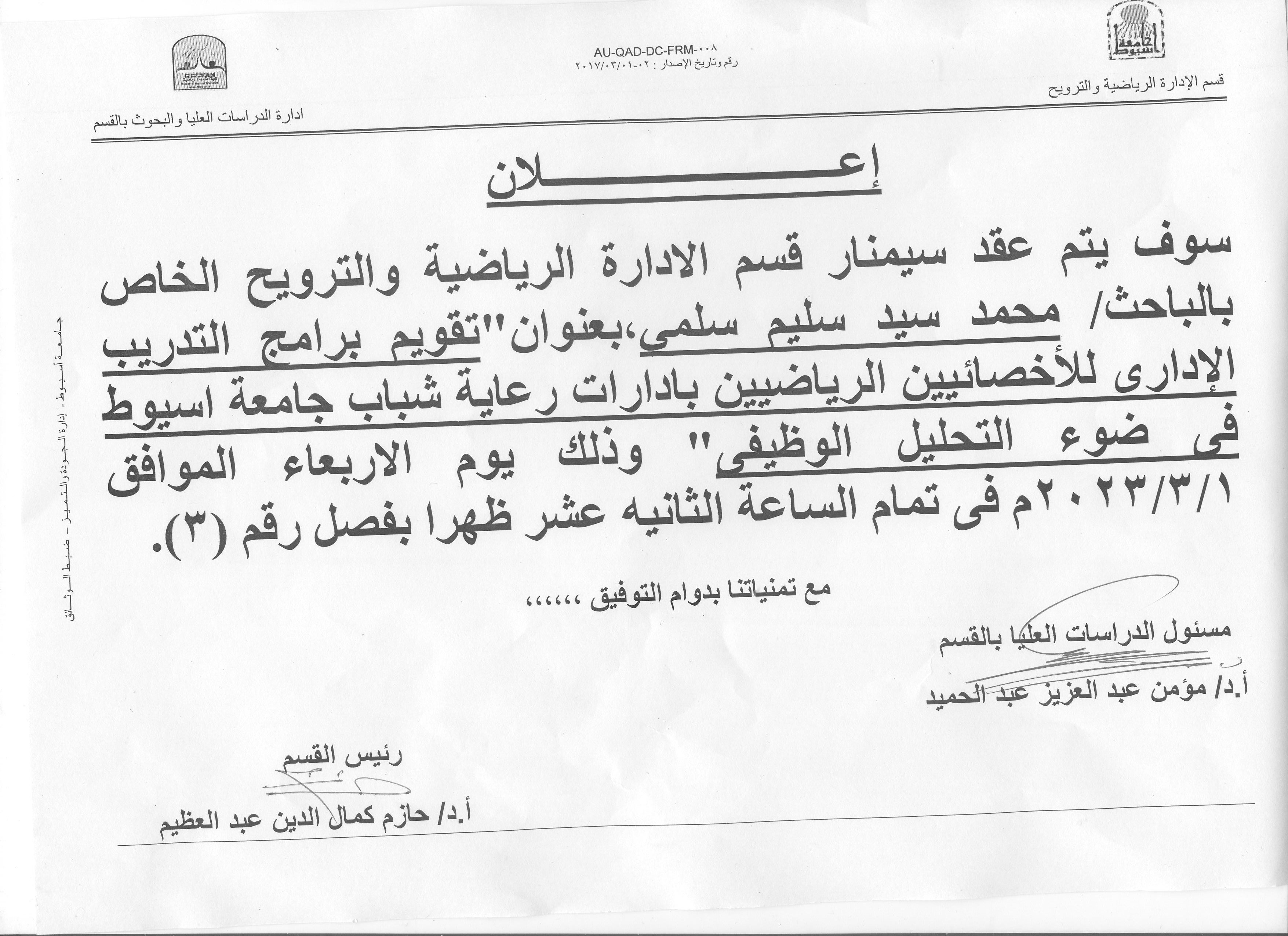 عقد سينمار للباحث/ محمد شحاته اسماعيل بقسم الادارة يوم الاربعاء 1/3/2023