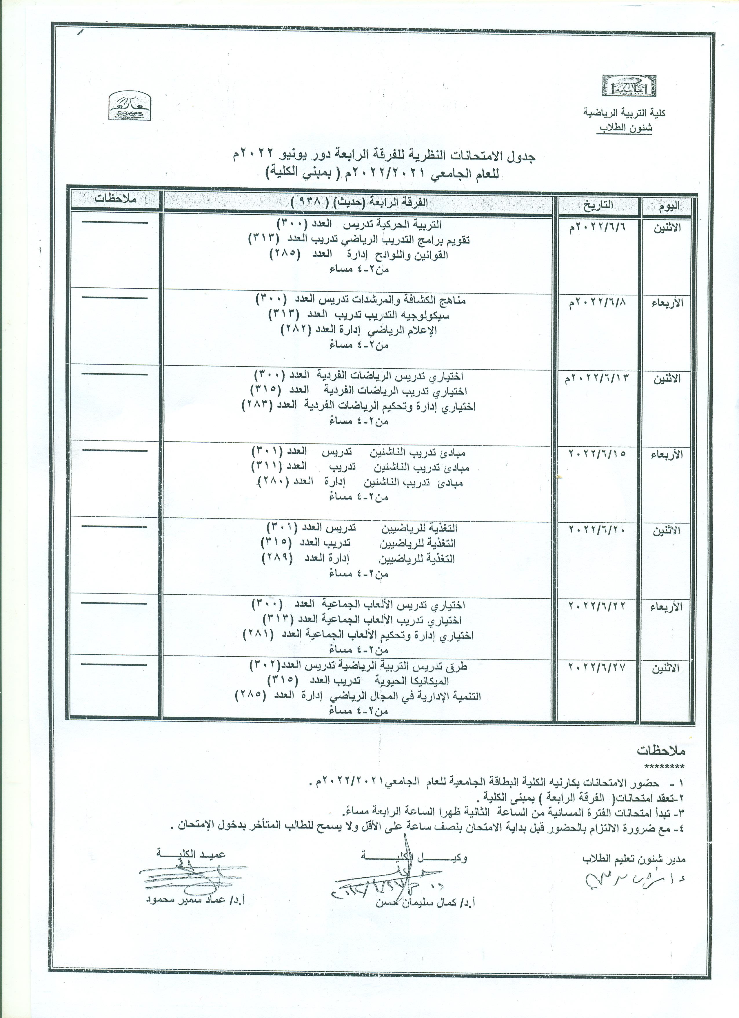 جدول امتحانات الفرقة الرابعة للفصل الدراسي الثانى للعام الجامعي 2021/2022 م