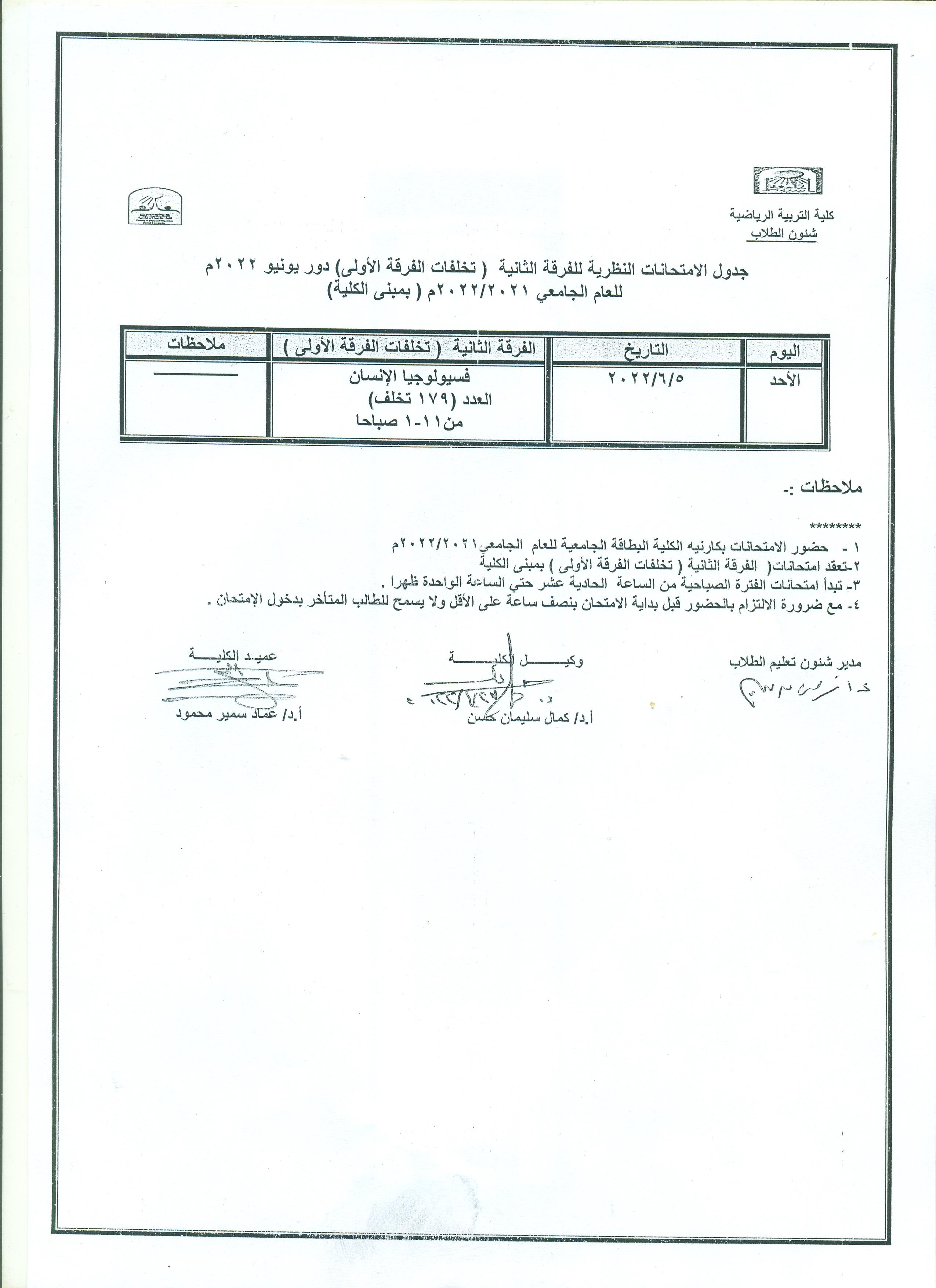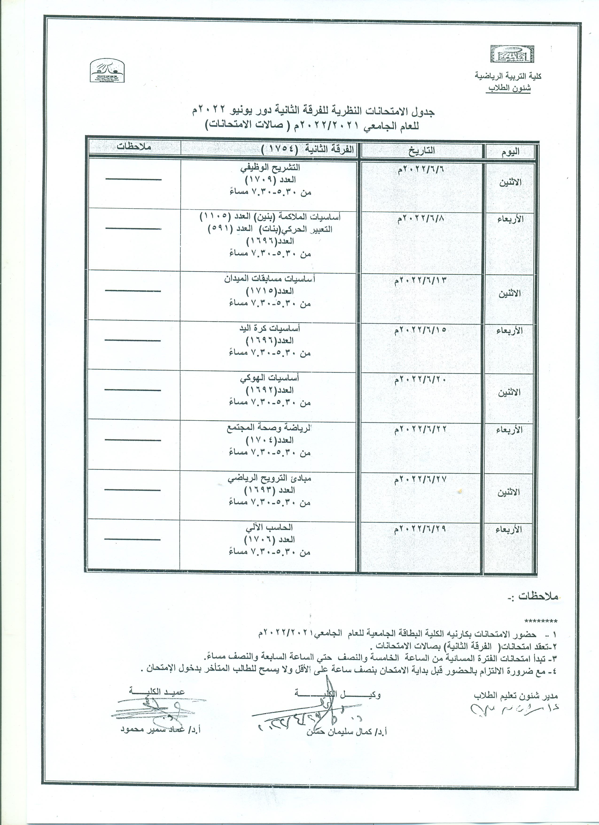 جدول امتحانات الفرقة الثانية للفصل الدراسي الثانى للعام الجامعي 2021/2022 م