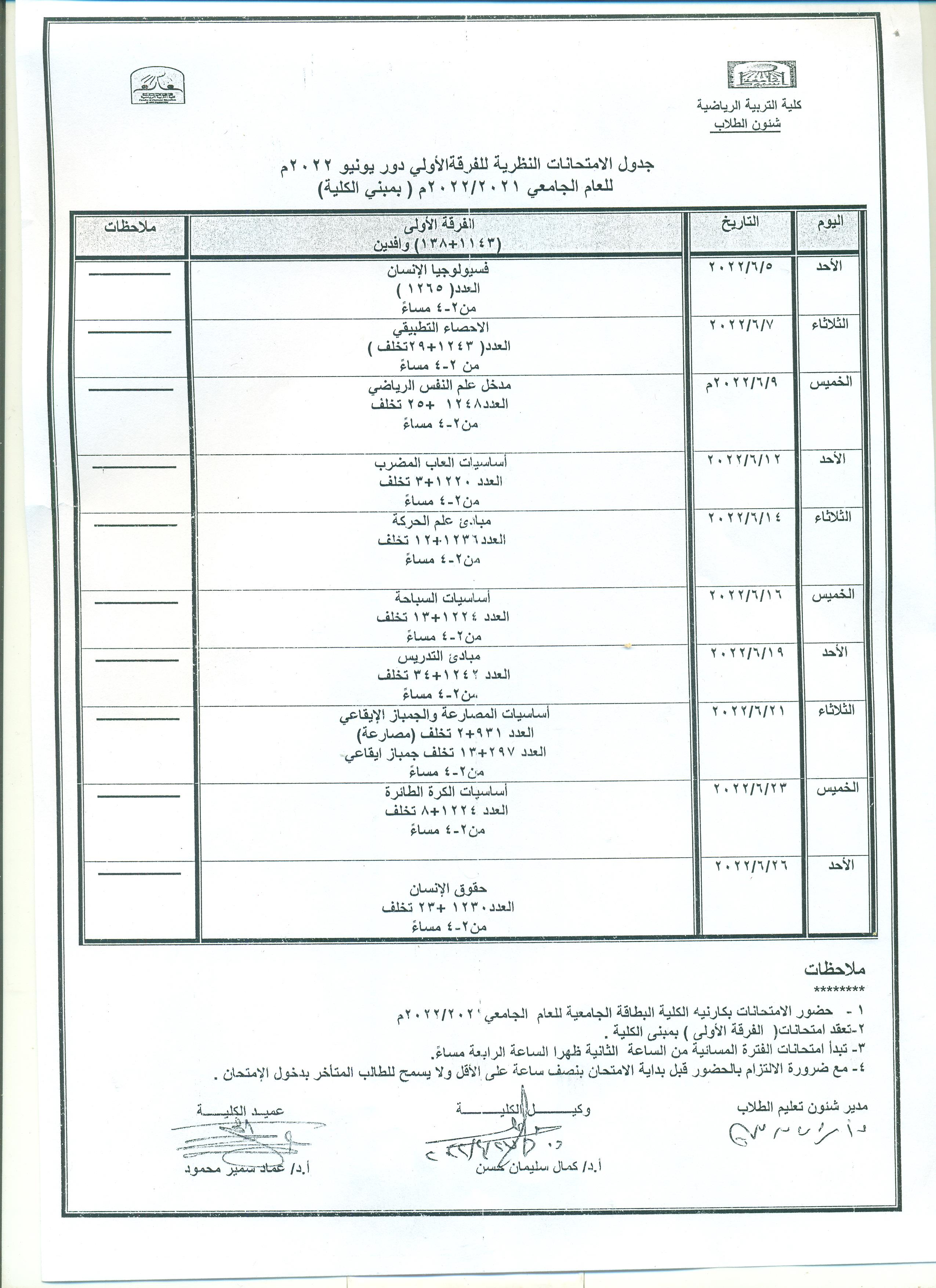 جدول امتحانات الفرقة الاولى للفصل الدراسي الثانى للعام الجامعي 2021/2022 م