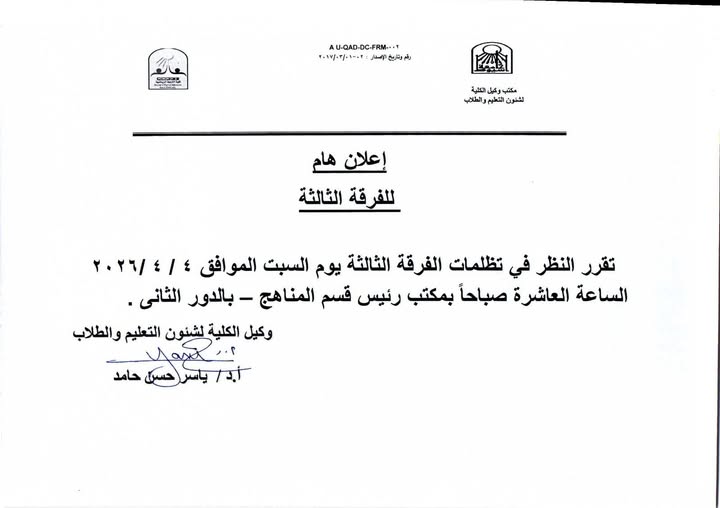 تقرر النظر في تظلمات الفرقة الثالثة يوم السبت الموافق ٤-٤-٢٠٢٦م الساعة العاشرة صباحا بمكتب الاستاذ الدكتور/ أيمن عبده محمد رئيس قسم المناهج وتدريس التربية الرياضية.