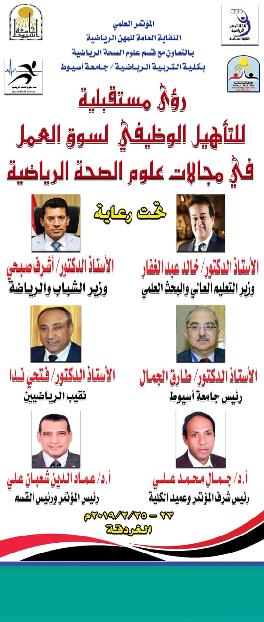 انطلق أعمال المؤتمر العلمي الذي ينظمه قسم علوم الصحة الرياضية بكلية التربية الرياضية بجامعة أسيوط، السبت 23 فبراير، بالتعاون مع النقابة العامة للمهن الرياضية بعنوان «رؤى مستقبلية للتأهيل الوظيفي لسوق العمل في مجال علوم الصحة الرياضية» وذلك تحت رعاية الدكتور خالد عبد الغفار وزير التعليم العالي والبحث العلمي والدكتور أشرف صبحي وزير الشباب والرياضة والدكتور طارق الجمال رئيس جامعة أسيوط والدكتور فتحي ندا نقيب الرياضيين، صرح بذلك والدكتور جمال محمد على رئيس شرف المؤتمر وعميد الكلية ..