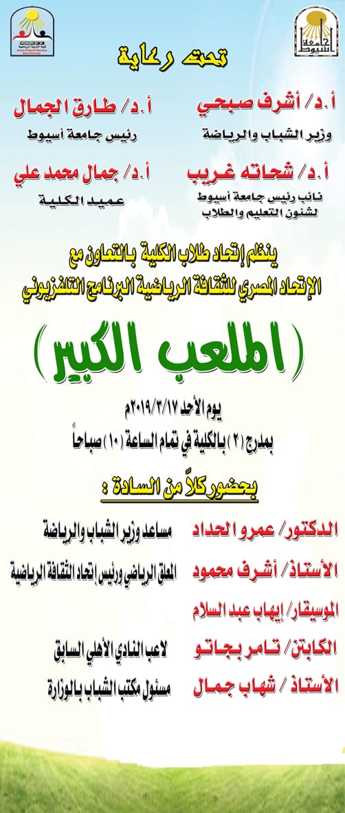 ينظم إتحاد طلاب كلية التربية الرياضية بالتعاون مع الإتحاد المصري للثقافة الرياضية البرنامج التلفزيوني ((الملعب الكبير))