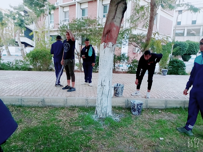 طلاب معسكر الفرقة الأولى كلية التربية الرياضية يبنون مقاعد بجوار أسوار الملاعب للاستخدام في الجلوس وحاجز للاتربة وأوراق الشجر ومنع خروج الكرات من تحت الاسوار
