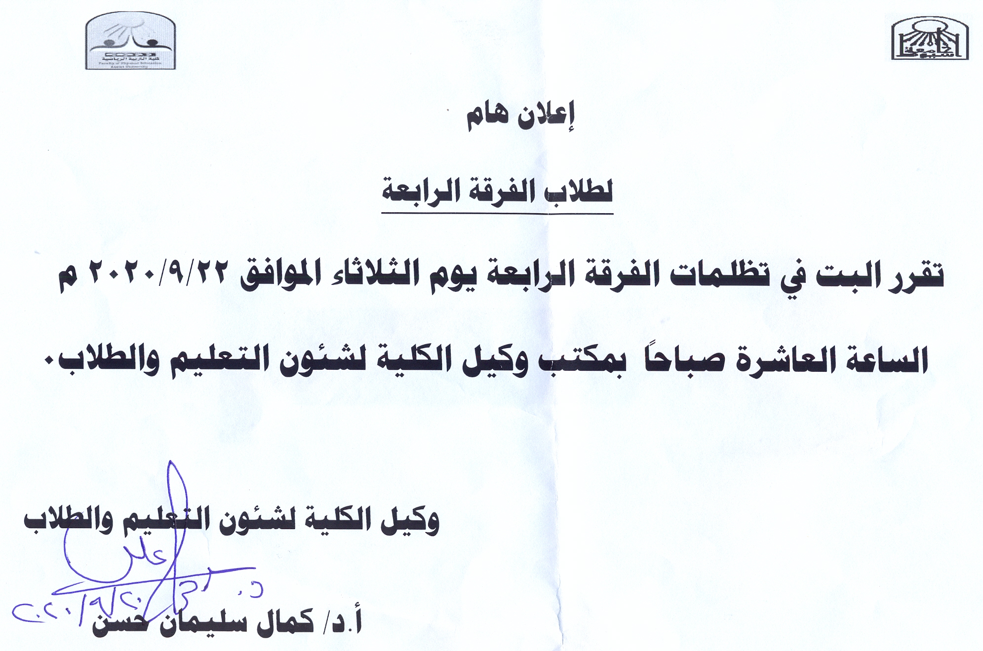 تقرر البت في تظلمات الفرقة الرابعة يوم الثلاثاء الموافق 22/9/2020م الساعة العاسرة صباحاً بمكتب الكلية لشئون التعليم والطلاب.