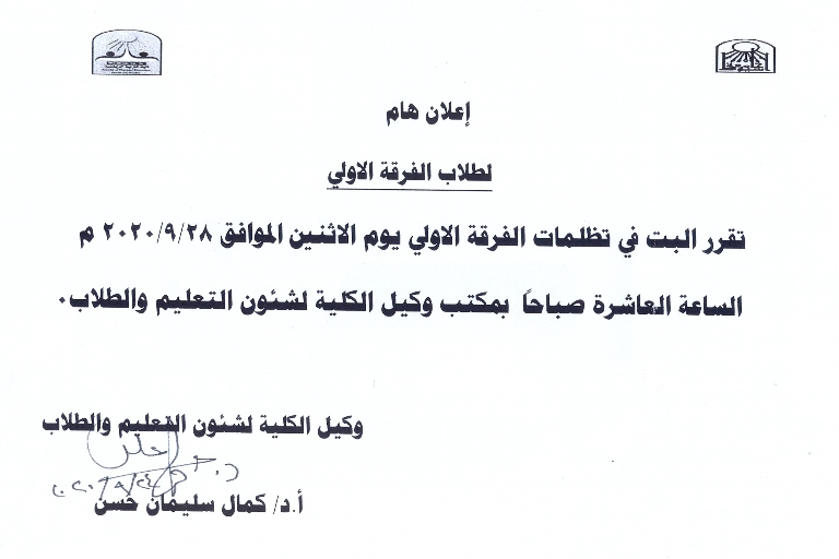 تقرر البت في تظلمات الفرقة الأولى يوم الاثنين الموافق 28/9/2020م الساعة العاشرة صباحاً بمكتب وكيل الكلية لشئون التعليم والطلاب.