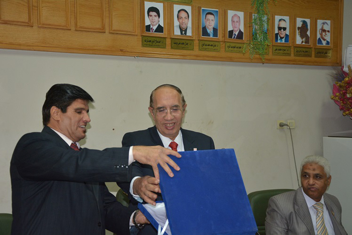 Mr. A. Dr. Ahmed Salah Qarah, Dean of the Faculty of Physical Education to dedicate the faculty shield to Prof. Dr. Ahmed Abdo Jaayy, rector of the university during his visit to the College the opening of the laboratory of Prof. Dr. Ahmed Abdo Jaayy for biomechanics, and Prof. Dr. Omar Shokri's Laboratory for sports physiology