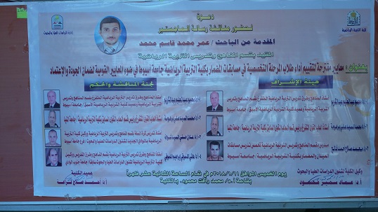 A master's thesis from the researcher/Omar Mohamed Kassem Mohammed, enrolled in the Curriculum and Sports Education Department, was discussed as "proposed criteria to assess the performance of the undergraduate students in the field competitions at the Faculty of Physical Education of Assiut University in light of national quality assurance standards and accreditation "under the supervision of Prof. Dr. Mahmoud Abdel Halim, professor of curriculum and methods of teaching full-time sports education at the Faculty of Physical Education, Assiut University and former dean of the faculty, WA. Dr. Mohamed El Sayed Ali, professor of full-time athletics and head of former athletics department, Faculty of Physical Education, Menia University, WAD/ Mohammed Salah Faleh teacher of curriculum and teaching of sports education Faculty of Physical Education, Assiut University, on Thursday 11/1/2018