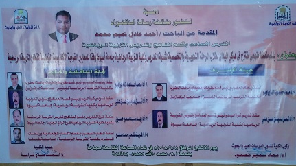 Doctoral thesis by researcher/Ahmed Adel Tamim Mohamed, assistant teacher, curriculum and Sports Education Department, entitled "Building a scheme methodology proposed in field hockey for pre-and specialized students of the Faculty of Physical Education at Assiut University, according to al-Ma'air The leading academic national of the sports education sector "under the supervision of a. Dr. Mohamed Ahmed Abdulla Ibrahim professor of tennis athletes and head of the Department of theory and applications of tennis at the faculty of Physical Education Boys University of Zagazig, WA. Dr/Kamal Suleiman Hasan Ali Professor of handball teaching and head of curriculum and teaching Department Sports education at the Faculty of Physical Education, Assiut University, on Monday 8/1/2018