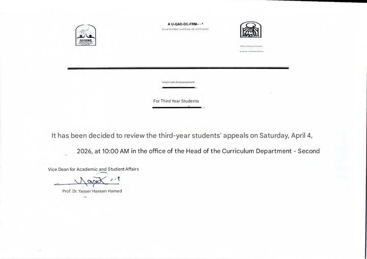 It was decided to consider the grievances of the third group on Saturday, April 4, 2026, at ten o'clock in the morning in the office of Professor Dr. Ayman Abdo Mohamed, Head of the Department of Curricula and Teaching of Physical Education.