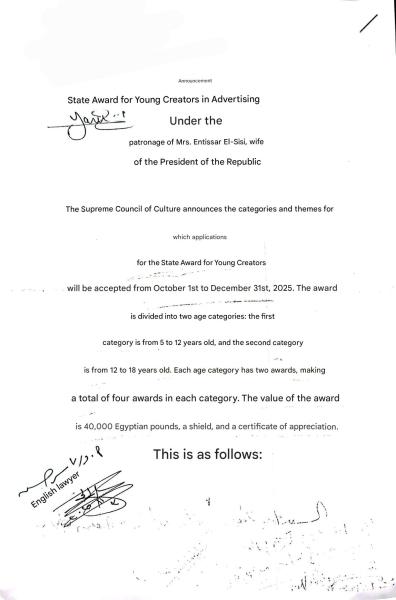 The Supreme Council of Culture announces the opening of applications for the State Award for Young Creators for 2025, from October 1st to December 31st, 2025.