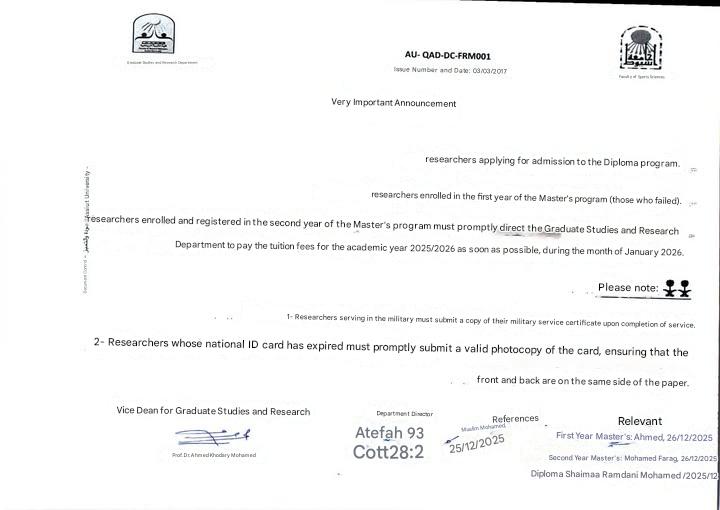 Please proceed to the Postgraduate Studies and Research Department to pay tuition fees for the 2025/2026 academic year as soon as possible, during the month of January.