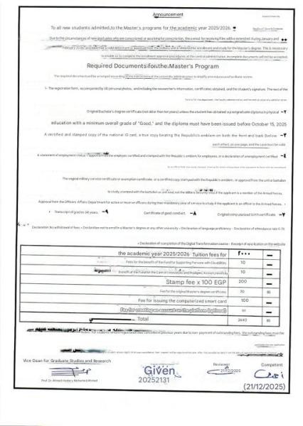 1- The registration form, accompanied by (4) passport-size photos, must include the applicant's information, academic certificates, and the applicant's signature. The remaining documents are for the department, college administration, and central university administration.