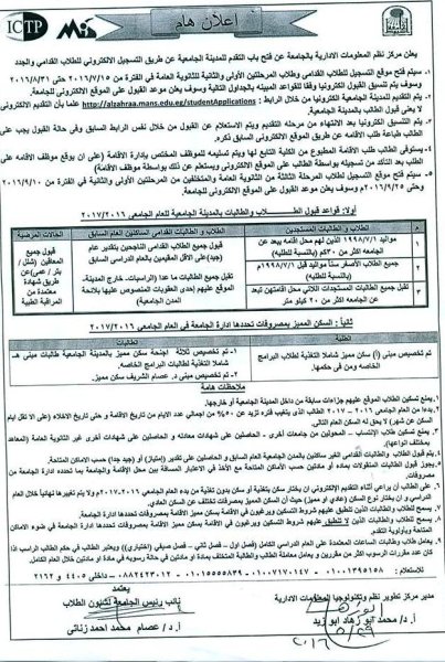 التقديم الإلكتروني للمدن الجامعية 13 يونيو 2016 يعلن مركز نظم المعلومات الادارية بالجامعة عن فتح باب التقدم للمدن الجامعية عن طريق التسجيل الالكترونى من خلال الرابط /http:alzahraa.mans.edu.eg/studentapplications