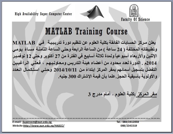 اليوم بدء الدورة تدريبية في MATLAB  وتطبيقاته المختلفة ( 24 ساعة ) من الساعة الرابعة وحتي الساعة الثامنة مساءً