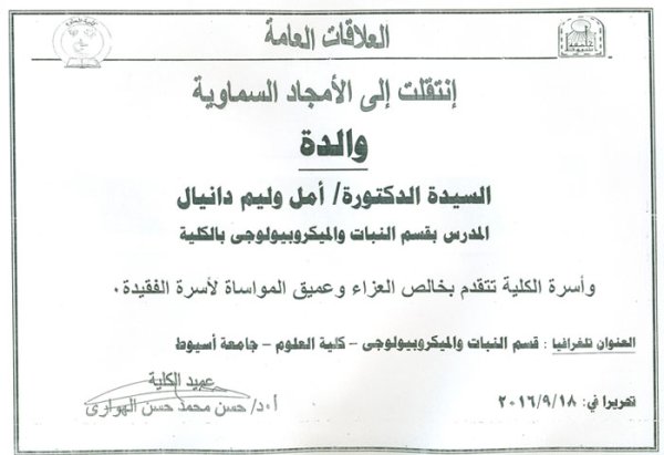 انتقلت الي الأمجاد السماوية والدة السيدة الدكتورة / أمل وليم دانيال 19 سبتمبر 2016 انتقلت الي الأمجاد السماوية والدة السيدة الدكتورة / أمل وليم دانيال