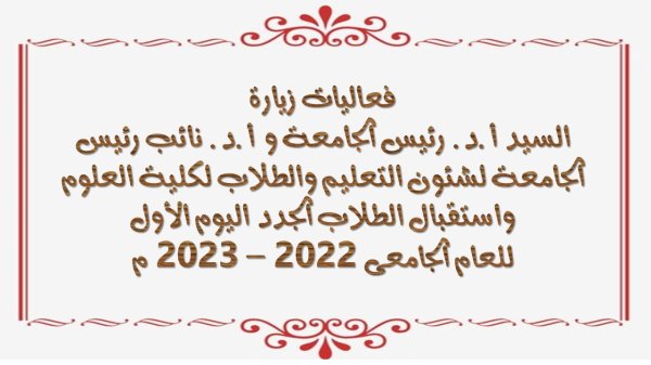 فعاليات استقبال كلية العلوم لليوم الأول للعام الجامعي 2022 - 2023 م 3 أكتوبر 2022 https://www.facebook.com/permalink.php?story_fbid=pfbid09ahetSksCSJHBTZSbEwxduqQe6xA3voS2JF8uRnAHb2j2G42AYREu2NzReFhUVkwl&id=100063745046656