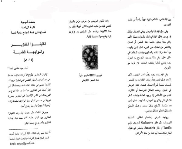 فى اطار مساهمة قطاع شئون خدمة المجتمع وتنمية البيئة بالكلية فى مواجهة المشكلات البيئية المعاصرة قد  نشرت مقالة علمية  حول مواجهة داء انفلونزا الخنازير للدكتور/سيد عاشور أحمد الأستاذ  بالكلية المدير السابق لمركز الدراسات والبحوث البئية بالجامعة