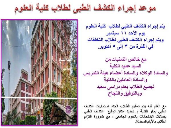 موعد الكشف الطبى للطلاب الجدد بكلية العلوم