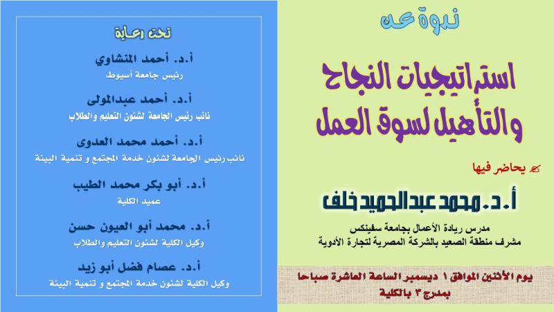ينظم قطاع خدمة المجتمع وتنمية البيئة بالكلية ندوة تثقيفية عن استراتيجيات النجاح و التأهيل لسوق العمل