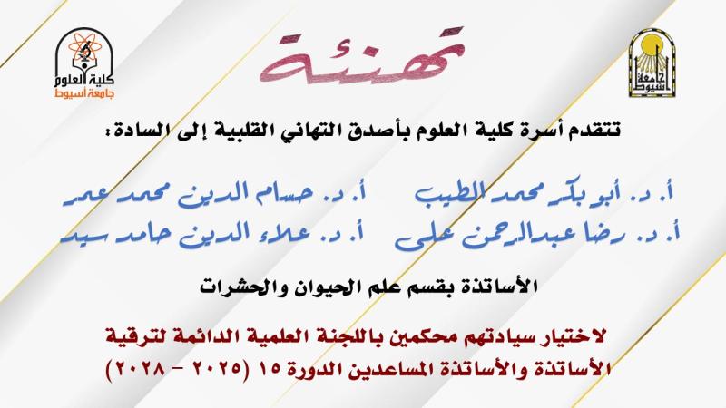 تتقدم أسرة كلية العلوم بأصدق التهاني القلبية الى السادة الأساتذة بقسم علم الحيوان والحشرات لاختيار سيادتهم أعضاء باللجنة العلمية الدائمة
