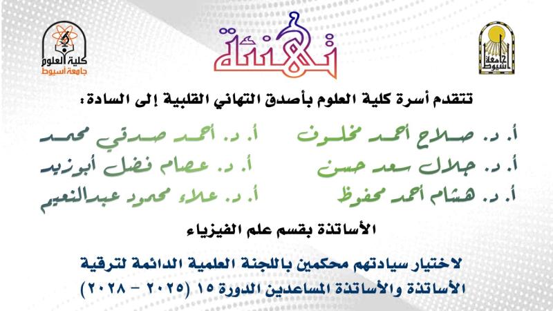 تتقدم أسرة كلية العلوم بأصدق التهاني القلبية الى السادة الأساتذة بقسم الفيزياء لاختيار سيادتهم أعضاء باللجنة العلمية الدائمة