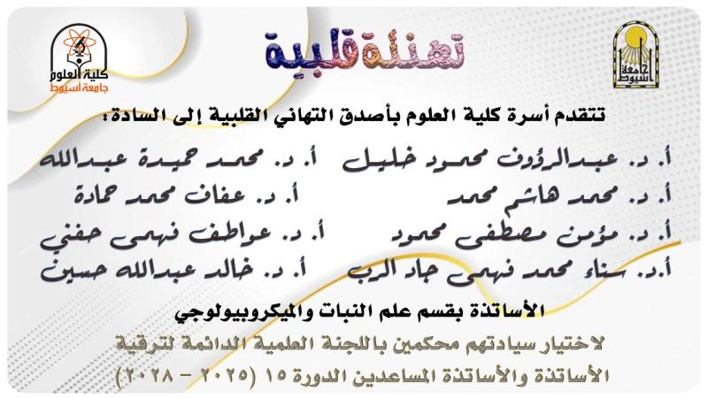 تتقدم أسرة كلية العلوم بأصدق التهاني القلبية الى السادة الأساتذة بقسم علم النبات والميكروبيولوجي لاختيار سيادتهم أعضاء باللجنة العلمية الدائمة