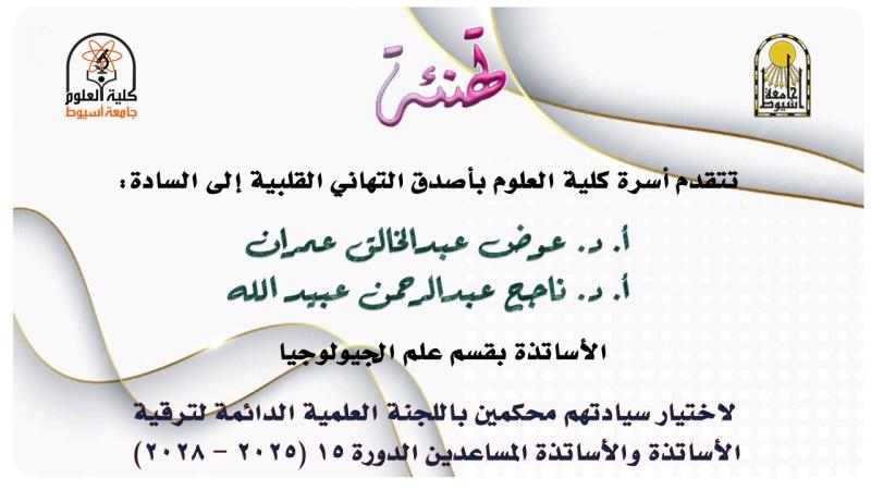 تتقدم أسرة كلية العلوم بأصدق التهاني القلبية الى السادة الأساتذة بقسم الجيولوجيا لاختيار سيادتهم أعضاء باللجنة العلمية الدائمة