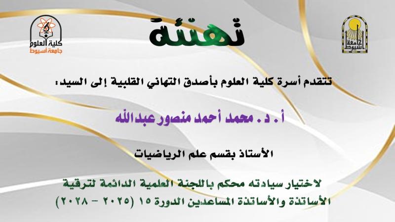 تتقدم أسرة كلية العلوم بأصدق التهاني القلبية الى السادة الأساتذة بقسم الرياضيات لاختيار سيادتهم أعضاء باللجنة العلمية الدائمة