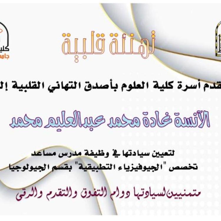 تتقدم أسرة كلية العلوم بأصدق التهاني القلبية إلى الآنسة غادة محمد عبدالعليم محمد لتعيين سيادتها في وظيفة مدرس مساعد تخصص "الجيوفيزياء التطبيقية" بقسم الجيولوجيا