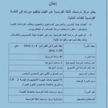 يعلن مركز دراسات اللغة الفرنسية عن القيام بتنظيم دورات فى اللغة الفرنسية للفئات التالية