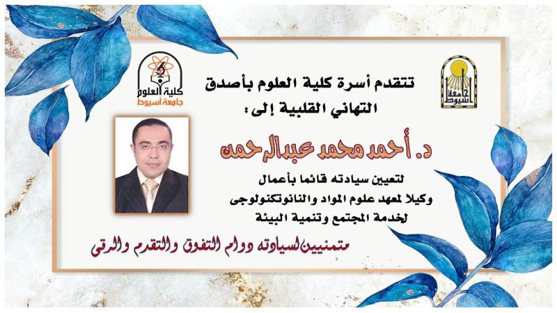 تتقدم أسرة كلية العلوم بأصدق التهاني القلبية إلى د. أحمد محمد عبدالرحمن لتعيين سيادته قائما بأعمال وكيلا لمعهد علوم المواد والنانوتكنولوجى لخدمة المجتمع وتنمية البيئة