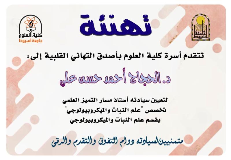 تتقدم أسرة كلية العلوم بأصدق التهاني القلبية إلى د. الحجاج أحمد حسن على لتعيين سيادته أستاذ مسار التميز العلمي تخصص "علم النبات والميكروبيولوجي" بقسم علم النبات والميكروبيولوجي