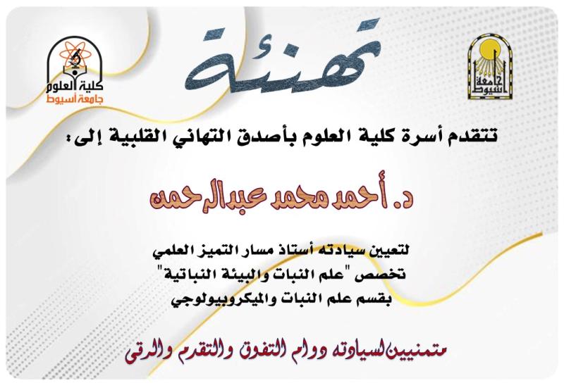 تتقدم أسرة كلية العلوم بأصدق التهاني القلبية إلى د. أحمد محمد عبدالرحمن لتعيين سيادته أستاذ مسار التميز العلمي تخصص "علم النبات والبيئة النباتية" بقسم علم النبات والميكروبيولوجي