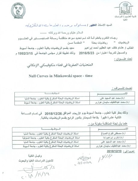 مناقشة رسالة الماجستير المقدمة من / هشام خلف عبد العظيم - قسم الرياضيات 24 ديسمبر 2018 مناقشة رسالة الماجستير المقدمة من / هشام خلف عبد العظيم - قسم الرياضيات