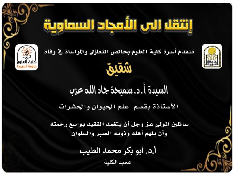 عزاء أسرة كلية العلوم الى أ. د. سميحة جادالله عزب الأستاذة بقسم علم الحيوان والحشرات في وفاة شقيق سياتها 13 نوفمبر 2025