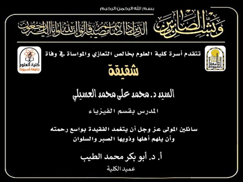 عزاء أسرة كلية العلوم الى السيد د. محمد على محمد العسيلي المدرس بقسم الفيزياء في وفاة شقيقة سيادته. 13 نوفمبر 2025