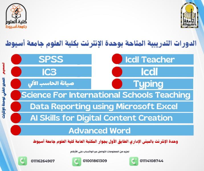 تعلن وحدة الانترنت بكلية العلوم جامعة أسيوط عن بدء التسجّيل في دورة IC3 أو ICDL 8 يناير 2026 للطلب أو الاستفسار عبر الواتساب: 01114108744 – 01116264907التسجيل من خلال الرابط https://docs.google.com/forms/d/e/1FAIpQLScNbIqwMQmu1j6WfQQt1LIHfoIFKfn9uxLpgVXiDgaSTYWD8Q/viewform