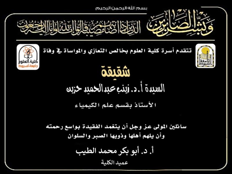 تتقدم أسرة كلية العلوم بخالص التعازي والمواساة في وفاة شقيقة السيدة أ. د. زينب عبدالحميد حزين الأستاذ بقسم علم الكيمياء 2 أبريل 2026