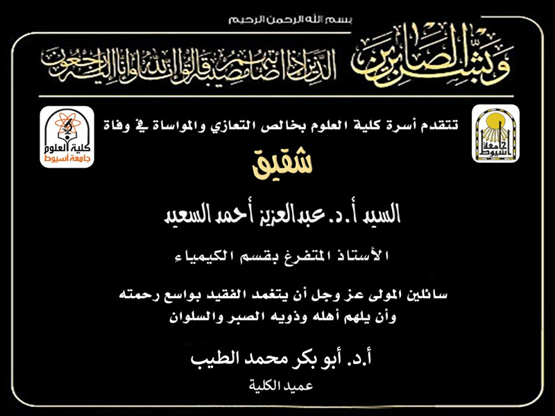 تتقدم أسرة كلية العلوم بخالص التعازي والمواساة في وفاة شقيق السيد أ. د. عبدالعزيز أحمد السعيد الأستاذ المتفرغ بقسم الكيمياء 7 أبريل 2026