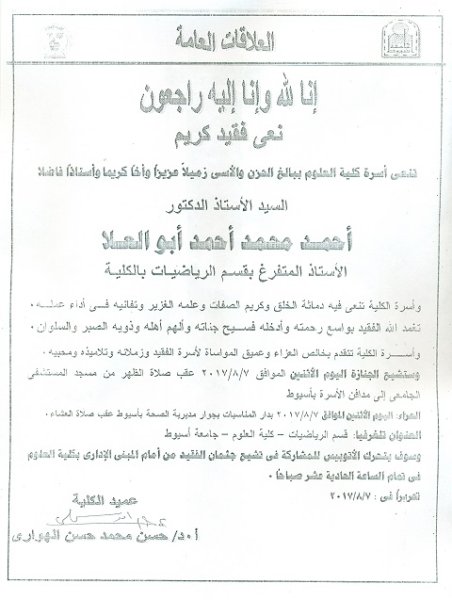 العزاء : اليوم الاثنين الموافق 2017/8/7 بدار المناسبات بجوار مديرية الصحة بأسيوط عقب صلاة العشاء