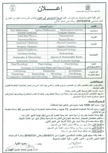 فتح باب القيد لدرجة الماجستير في العلوم للعام 2019/2018
