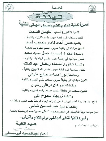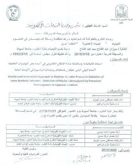 تحديد موعد مناقشة رسالة الماجستير المقدمة من الطالب / سوزان عبد الفتاح سيد - قسم الكيمياء