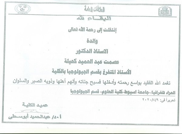 تتوجه اسره كليه العلوم جامعه اسيوط والسيد الاستاذ الدكتور عبد الحميد ابو سحلي عميد الكليه والاستاذ الاستاذ الدكتور كمال إبراهيم وكيل الكلية لشئون البيئه وتنميه المجتمع والاستاذ الدكتور جمال بدر وكيل الكلية لشئون الدراسات العليا والبحث العلمي والاستاذ هشام عبد الرحمن أمين عام كليه العلوم  بالتهنئة القلبيه الي شركاء الوطن اخوتنا المسيحين بمناسبه عيد القيامه المجيد .