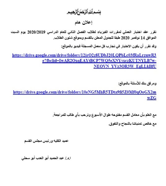 اختبار العملي لمقرر الفيزياء للفصل الدراسي الثاني 2019/2020 يوم السبت الموافق 14 نوفمبر 2020