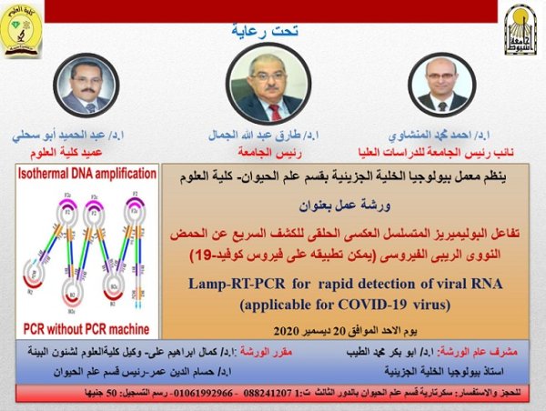 اليوم ورشة عمل بعنوان " تفاعل البوليميريز المتسلسل العكسي الحلقي للكشف السريع عن الحمض النووي الريبي الفيروسي(يمكن تطبيقه علي فيروس كوفيد -19)