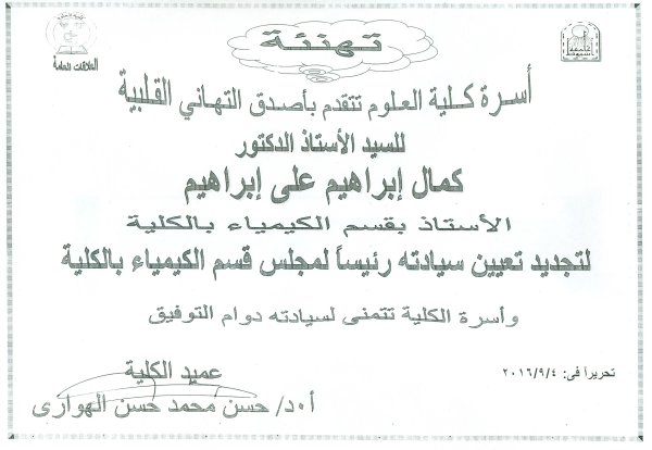 تهنئة للسيد الأستاذ الدكتور / كمال ابراهيم علي ابراهيم 5 سبتمبر 2016 تهنئة للسيد الأستاذ الدكتور / كمال ابراهيم علي ابراهيم