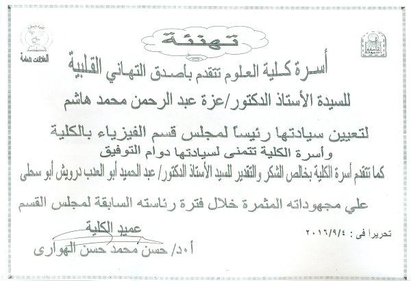 تهنئة للسيدة الاستاذ الدكتور / عزة عبد الرحمن محمد هاشم 5 سبتمبر 2016 تهنئة للسيدة الاستاذ الدكتور / عزة عبد الرحمن محمد هاشم